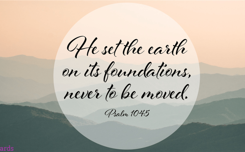 He set the earth on its foundations, so that it should never be moved. You covered it with the deep as with a garment; the waters stood above the mountains. At your rebuke they fled; at the sound of your thunder they took to flight. The mountains rose, the valleys sank down to the place that you appointed for them. You set a boundary that they may not pass, so that they might not again cover the earth. You make springs gush forth in the valleys; they flow between the hills; they give drink to every beast of the field; the wild donkeys quench their thirst. Beside them the birds of the heavens dwell; they sing among the branches. From your lofty abode you water the mountains; the earth is satisfied with the fruit of your work. You cause the grass to grow for the livestock and plants for man to cultivate, that he may bring forth food from the earth and wine to gladden the heart of man, oil to make his face shine and bread to strengthen man’s heart. The trees of the LORD are watered abundantly, the cedars of Lebanon that he planted. In them the birds build their nests; the stork has her home in the fir trees. The high mountains are for the wild goats; the rocks are a refuge for the rock badgers. He made the moon to mark the seasons; the sun knows its time for setting. You make darkness, and it is night, when all the beasts of the forest creep about. The young lions roar for their prey, seeking their food from God. When the sun rises, they steal away and lie down in their dens. Man goes out to his work and to his labor until the evening. O LORD, how manifold are your works! In wisdom have you made them all; the earth is full of your creatures. (Psalms 104:5-24)