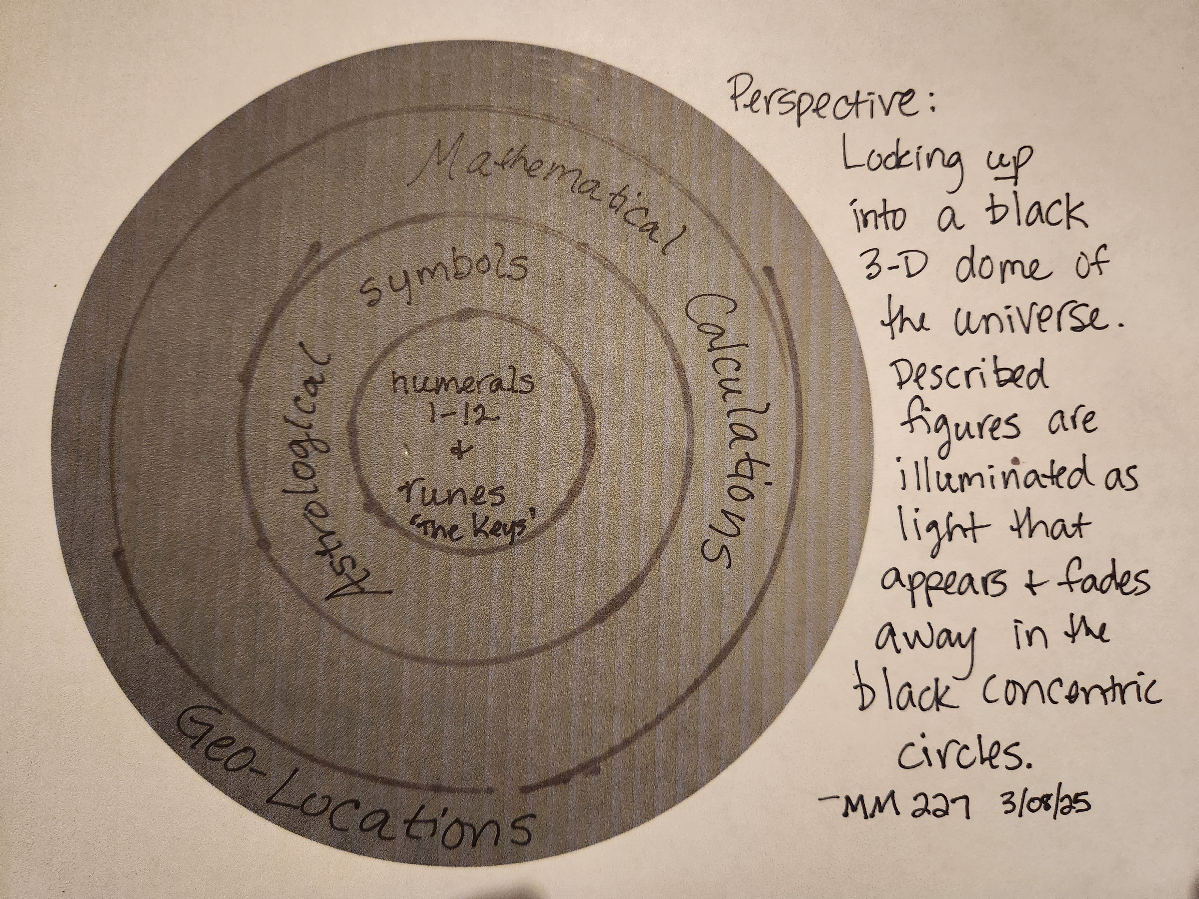 To begin, my perspective was looking up into this dome above me as if I were in the center, below it, and it was coming all the way down to the earth. Like I was on a cake plate and the huge domed top was covering me in black. God then made to appear a central area/circle of jumbled numerals with some runes. These appeared as light coming through the black. God could make all of this fade in and out immediately, so it seemed as if it is always there, but you can only see it if He reveals it to you. Although I did not visualize all the numerals, I knew there were around 12, plus about 5 or so runes. The dream then progressed to God revealing the next circle which were symbols which I understood to be astrological symbols. These were scattered about the ring.